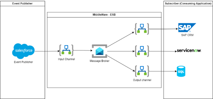 ESB is implementing a near-real time solution based on the Publish and Subscribe pattern to deliver platform events from Jupiter, or Kantata. We apply this model for those cases, where the source application provides access only to events (creation/change/deletion) for objects, and we do not have direct access to the data source. ESB provides a solution, which can deliver these changes to multiple applications parallel. Distribution of the events are happening based on a subscription. The changes are transferred to the consumers either via APIs, or database directly.